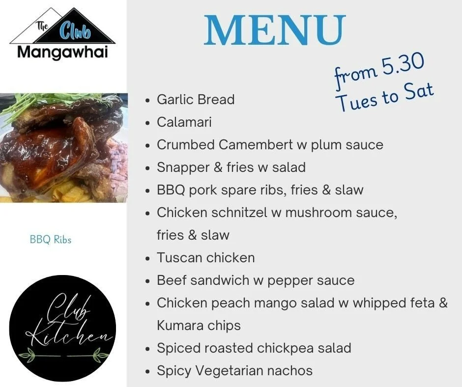 Check out Club kitchen at The Mangawhai Club on Facebook for updates.